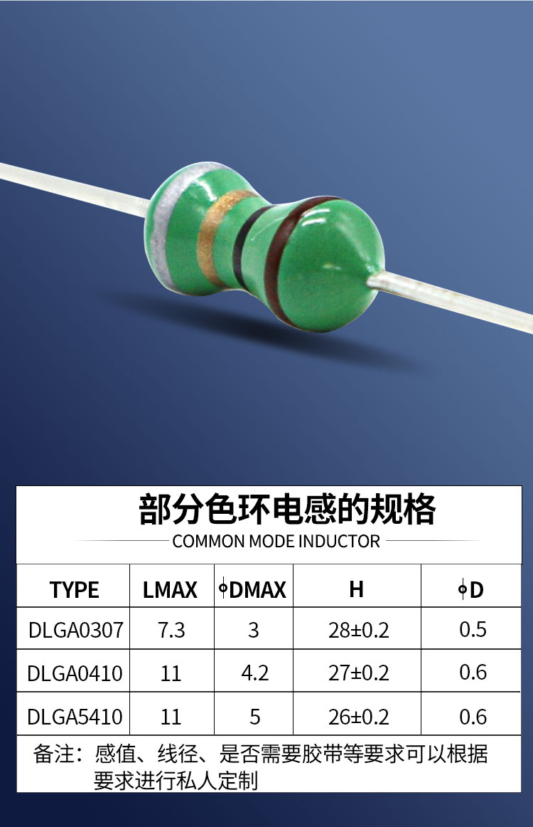 DLGA0510色環電感:尺寸:11.0*5.0;感量:470uH-10mH;精度:J級(±5%)、K級(±10%)、M級(±20%);電流量:25mA-126mA;特點:高Q值,重量輕,自共振頻率高;適用于:電視、DVD、計算機、通訊產品等。詳情咨詢:0512-65368862。